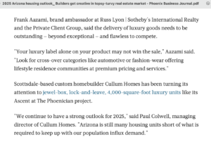 “The luxury market is not collapsing, but rather transitioning from a red-hot Seller’s climate to a more balanced or buyer-favorable environment in many submarkets,” Aazami said. J. Andrew Turley, president of Phoenix Valuations, said the exuberance in the Valley’s luxury market has faded. “Certainly the luxury and ultra luxury markets are very strong by most fundamentals in comparison, but long gone are the days of asking $1,400 to $2,000 per square foot and not getting much price competition or buyer scrutiny,” Turley said. “There are homes in this range that sell, but they are on choice streets, in choice boroughs, with epic architectural and interior design.” Overall, there have been many speculative builders getting in the marketplace that are “move up” developers from lower price points saturating the luxury market especially in the $6 million to $10 million range, he said.